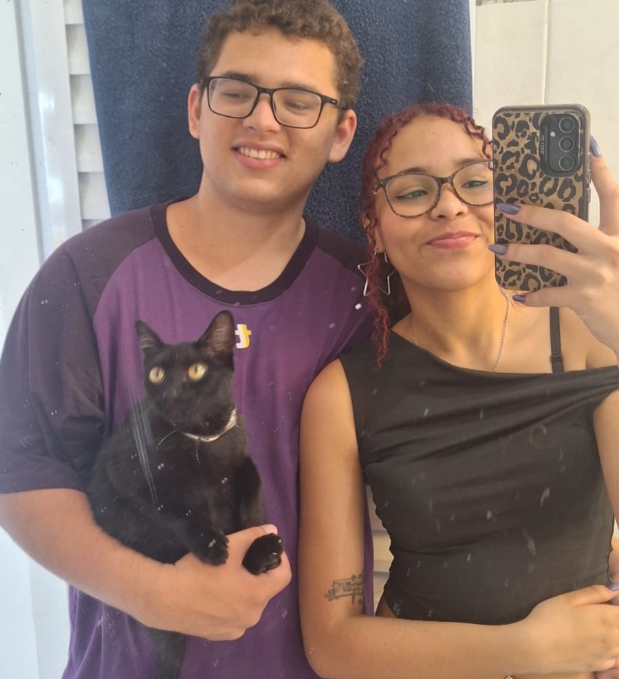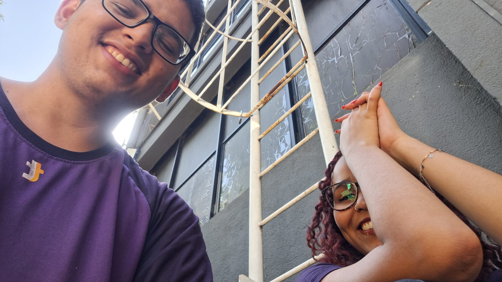 07/12/2025, Ă s 14:43, nossa primeira foto juntos. Sentamos no chĂŁo porque tinha um carro na nossa vaga e a escadinha estava ocupada (pelo Vitor). Tentei tirar a foto o mais espontĂąnea possĂvel, para capturar a essencia do seu sorriso mas Ă© impossĂvel capturar em uma imagem.